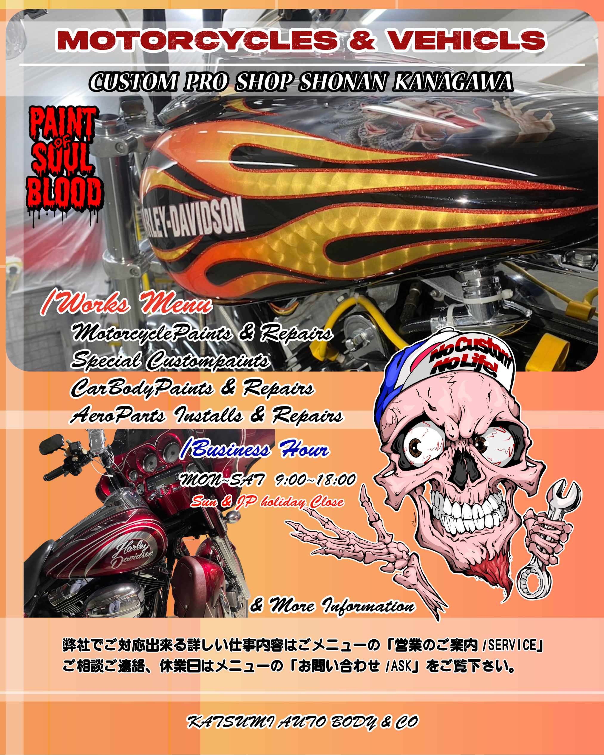 弊社は自動車やバイクのカスタマイズやカスタムペイント。キズ・凹みを修理する専門工場です。