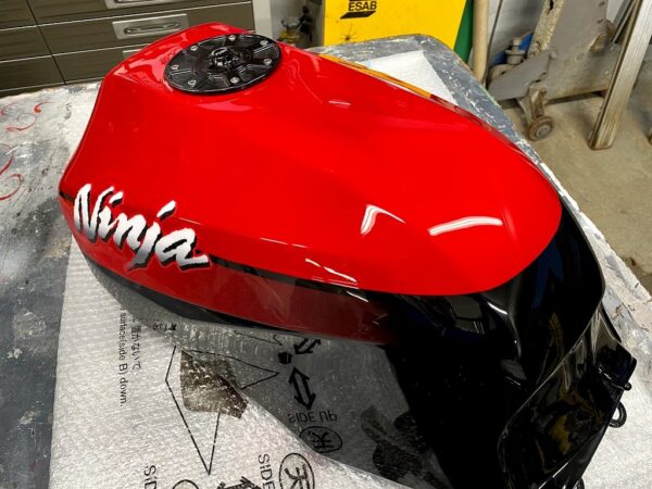 KAWASAKI GPZ タンクリペア。 2019年1月15日 カワサキGPZのタンクをリペアさせて頂きました。 かなりのBIGダメージでしたが完全に修復しました。 デカールは廃盤で希少品と言う事で剥がすことは出来ませんのでリヤ部のみ剥がしフロントのパターン部とリヤ部をグラデーションでペイントし生かすように修復してあります。