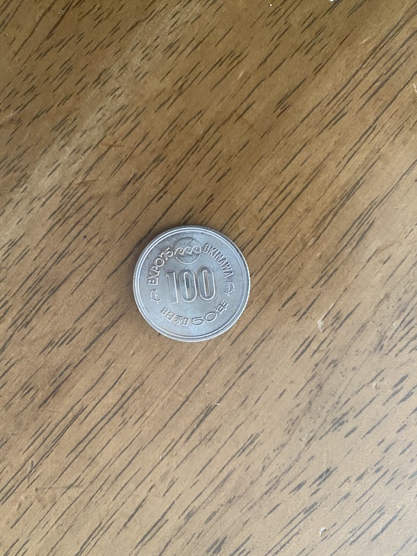自販機からこんな百円出て来ましたぜ。昭和50年の沖縄エキスポ記念コイン。
