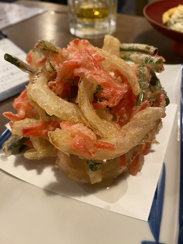 最後は紅生姜かき揚げ。この時点で紅生姜を食べると大阪の雰囲気になるマジックに気がつきます。しかし紅生姜はやっぱり大阪の味です。