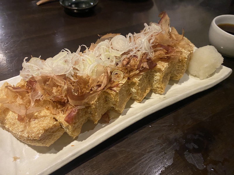 栃尾油揚げ。通常の油揚げより3倍くらい厚みがあって出汁をかけて食す。日本酒にもビールにも合います。