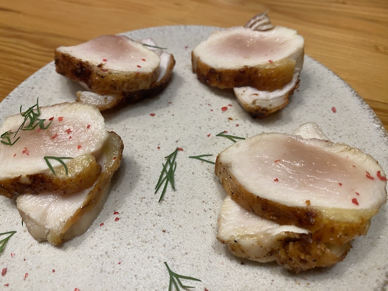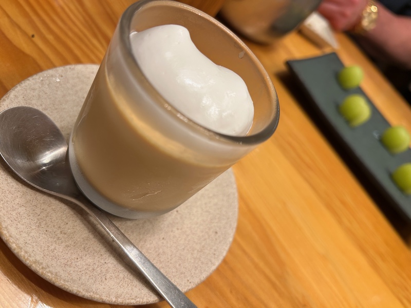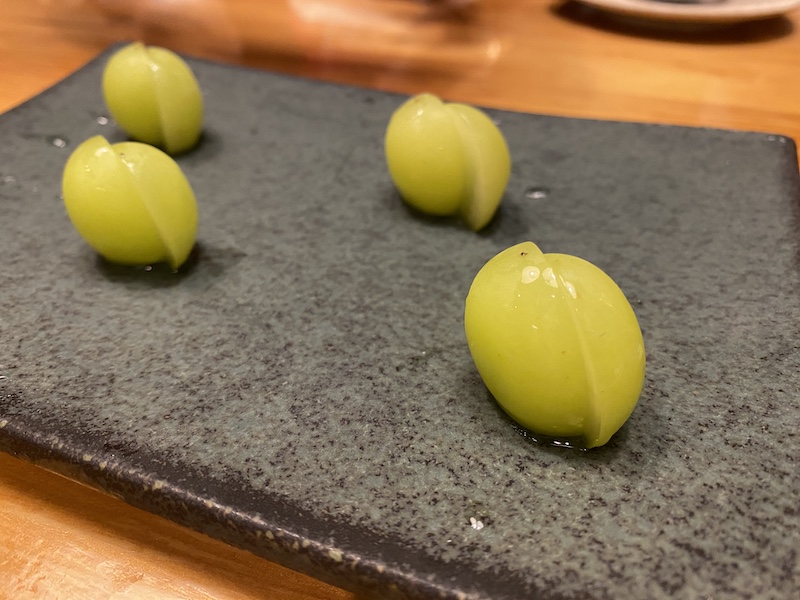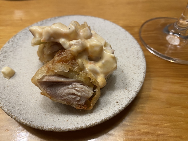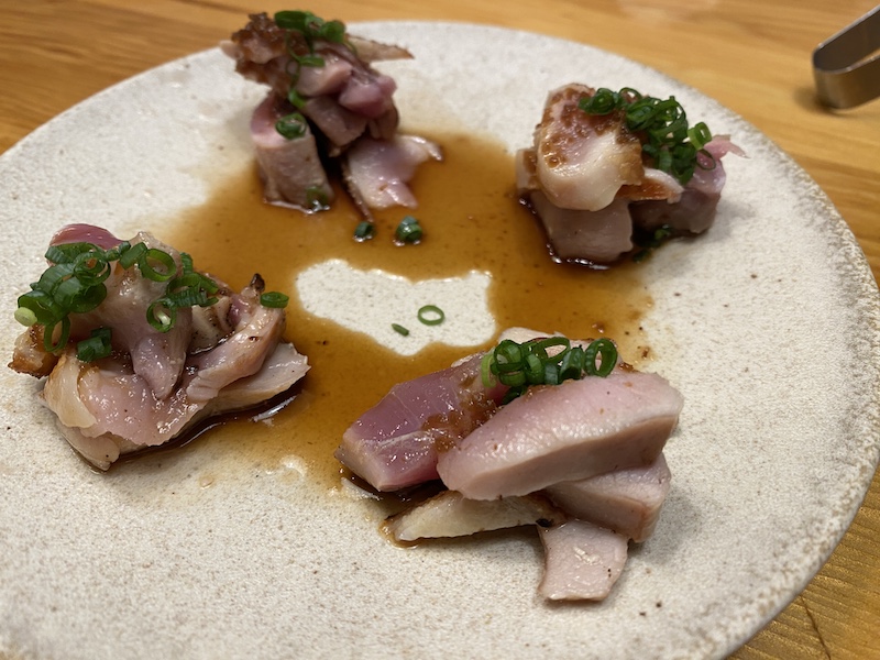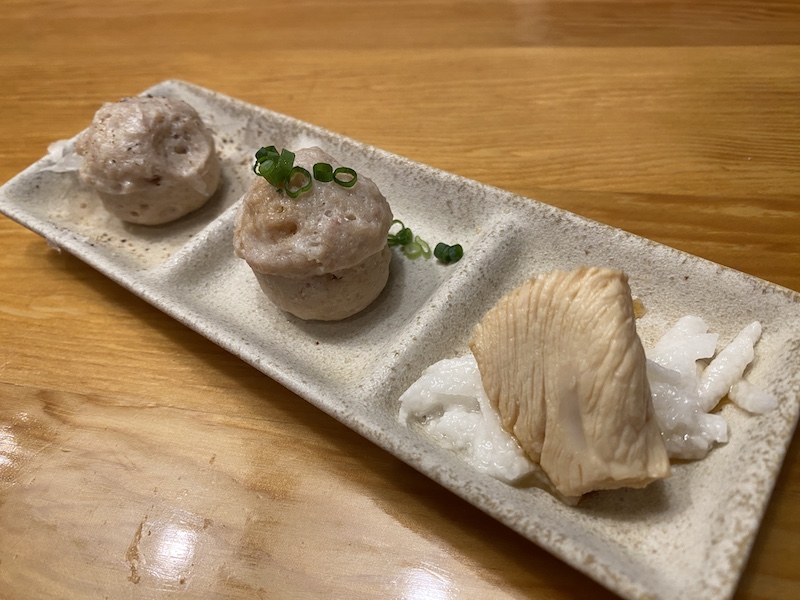 先付けは料理3品盛り。地鶏の蒸しつくねとムネ肉漬けと書かれておりましたが、フワフワで鳥のムース食べてるような感じであります。右から順番に食べてくださいと言うマニュアル付きであります。その意味がよくわかる。