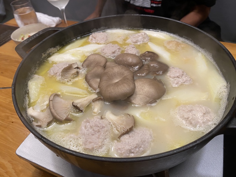 地鶏白湯鍋。スープは飲みすぎないようにと店員さんより注意喚起が発せられます。