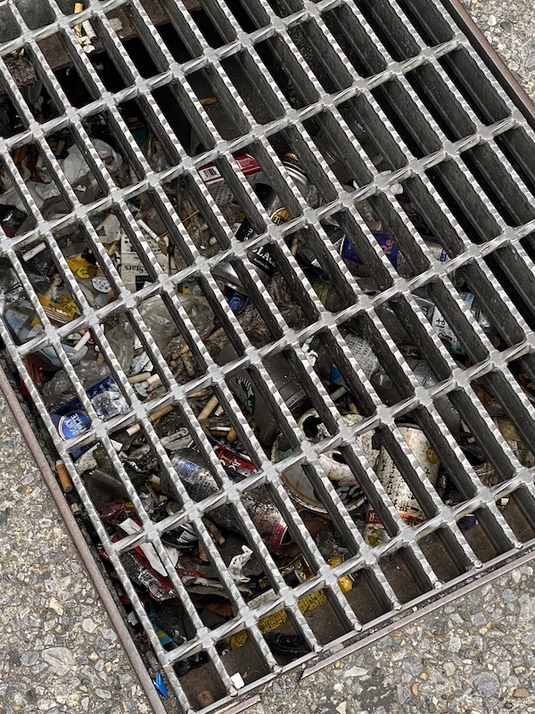 ジムのあるビル前の側溝。網があるのどうして入った?、、、、流れてきたのか?
