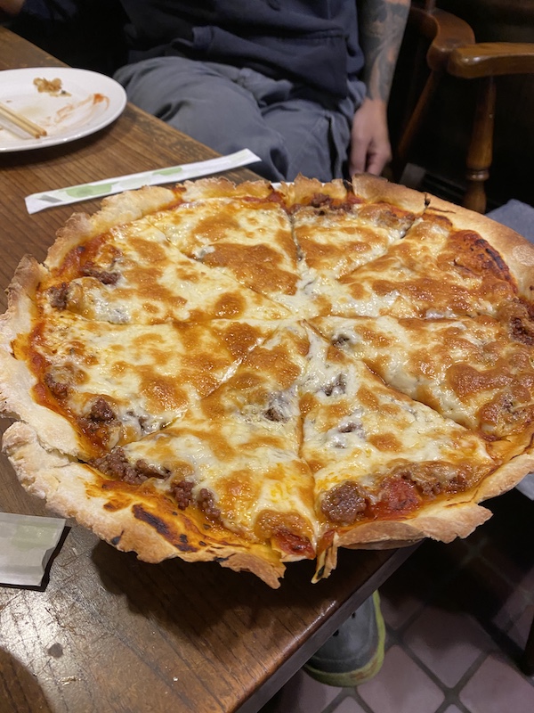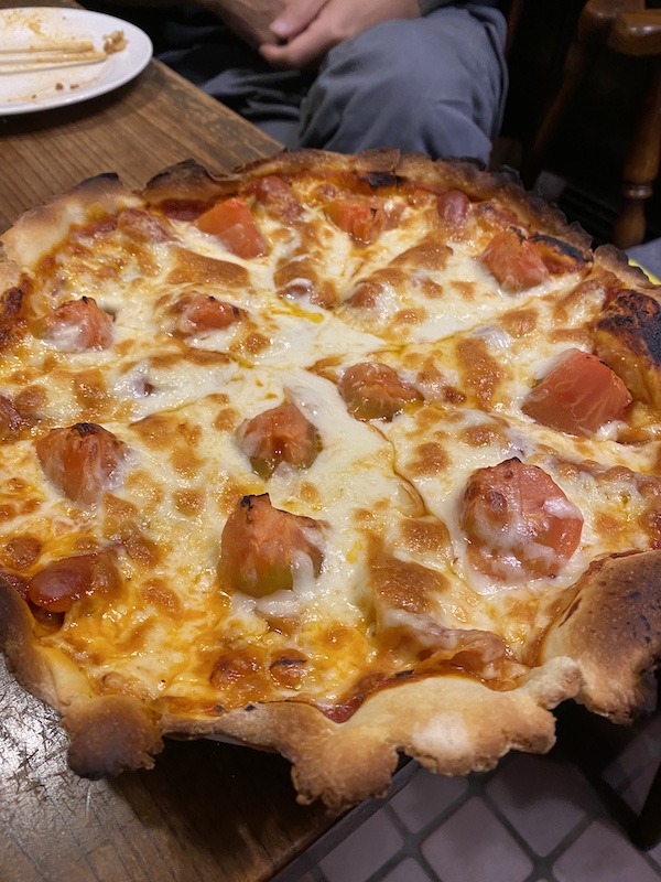 まずは名物ハンバーグピザからスタート。めっちゃ美味いんですけど爆発的カロリー。