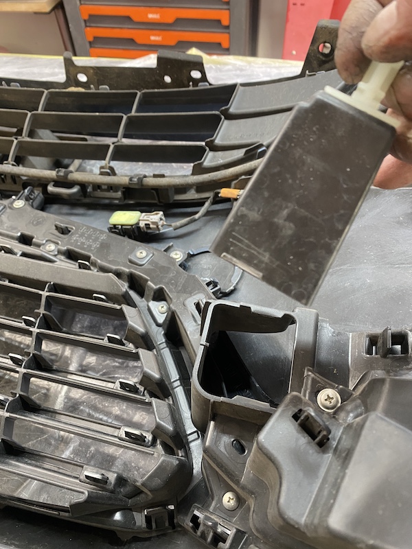 マツダのフロントヒットの車を直しておりまして外見がズレまくっていた件、分解しましたところグリルインナーの肝心なステーが折れてしまっておりました。