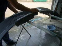 320♯程度のサンダーで、表面のザラつき、小さな凹凸をすべて削りまして、ウレタンサフェーサーをコート。 |
